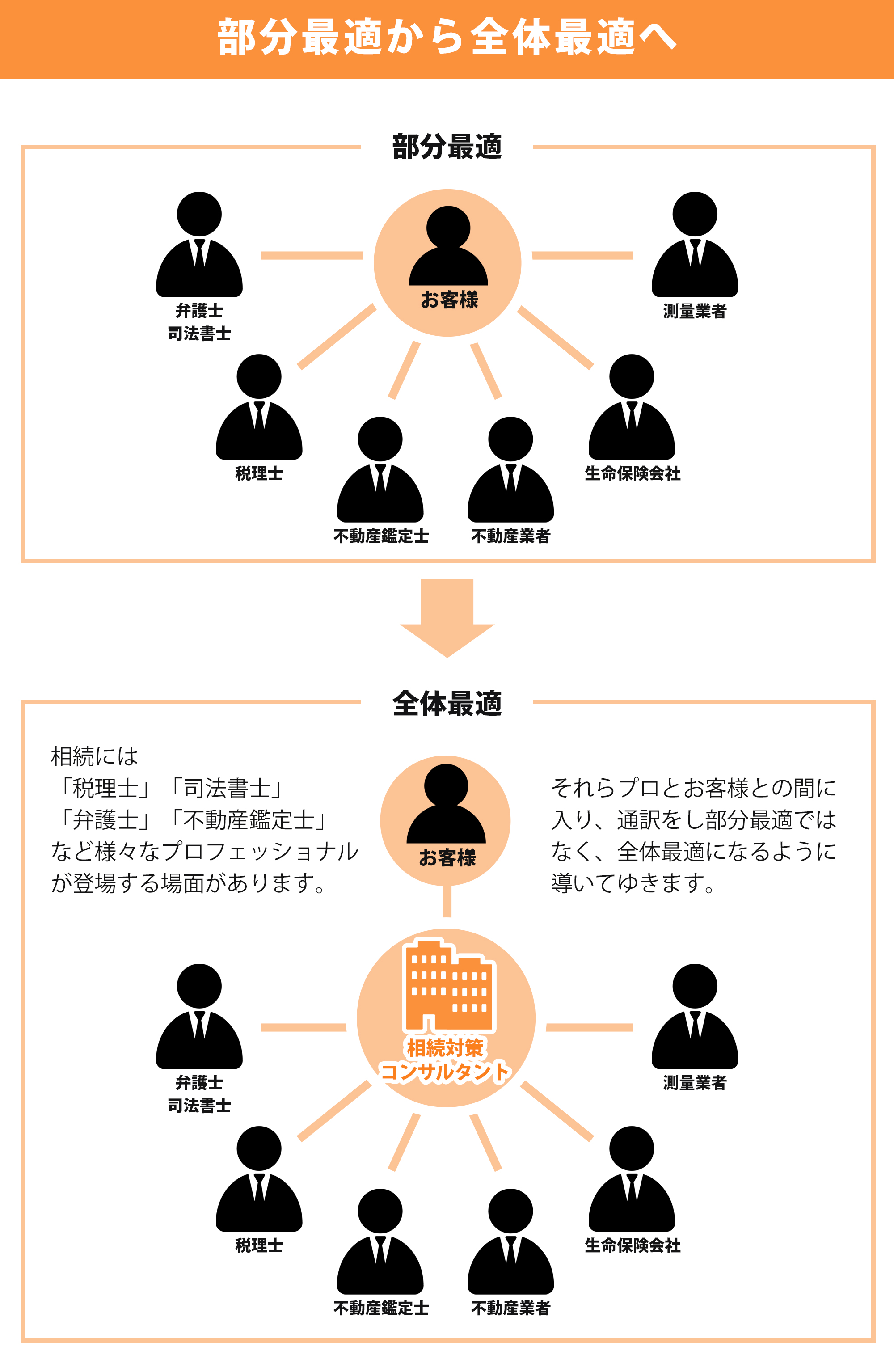 相続には、相続税の他に遺産分割や生命保険、後見制度、家族信託など様々な要素が入るので複合的に考えなければなりません。遺産分割では税理士が作成した財産目録では不動産の評価額が記載されているだけで、時価が記載されていません。税理士は相続税申告するのが仕事ですからそれで正しいのです。時価は不動産業者、若しくは不動産鑑定士が出します。そんな時に、相続対策コンサルは顕在化している課題を解決したり、現状分析をして課題を見つけ、対策案を立案し、それに必要なプロを集めて解決していくものです。